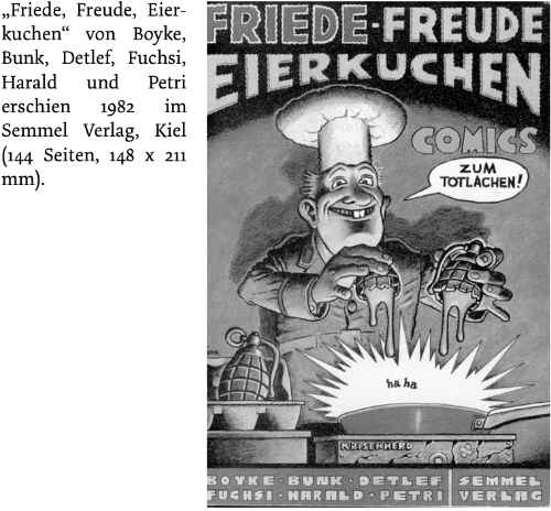 In ähnlicher Besetzung – wieder mit Harald Juch, Detlef Surrey, Peter Petri, Peter Fuchs, verstärkt um Rolf Boyke und Tomas Bunk – entstand 1982 das Comicbuch „Friede, Freude, Eierkuchen“ (Semmel-Verlag, Kiel). Dieses Mal allerdings mit einem pazifistischen Grundton.