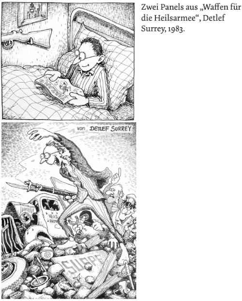 Detlef Surrey: Sehr stark beeinflusst war ich von den amerikanischen Underground Zeichnern. Gilbert Shelton, Robert Crumb, Ron Cobb. Gerhard Seyfrieds anarchisch optimistischer Humor war lange für mich prägend.