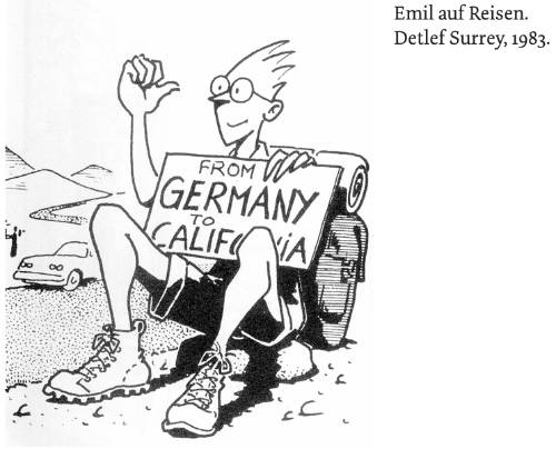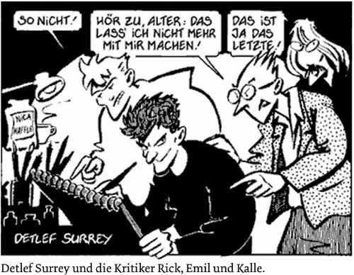 Detlef Surrey: 1983 war ich für einige Wochen in Barcelona. Die dortige Comic Szene faszinierte mich. Man spürte den kulturellen Aufbruch nach der Stagnation in der Franco-Zeit. Es gab sehr interessante Zeichner (Mariscal, Pere Joan oder Max) und innovative Comic Magazine (El Víbora, Cairo, Makoki, Madriz). Sie waren auch politisch anarchisch – aber gleichzeitig grafisch sehr interessant! Das hat mich stark inspiriert. Zurück in Deutschland brach ich mit meinem Underground Zeichenstil und scribbelte die ersten Emil 4-Bild-Comic-Strips. Die „Zitty“ reagierte sehr positiv darauf – und ab Sommer 1983 war der Strip ein fester Bestandteil der Zeitschrift – bis ich die Serie 1991 einstellte.