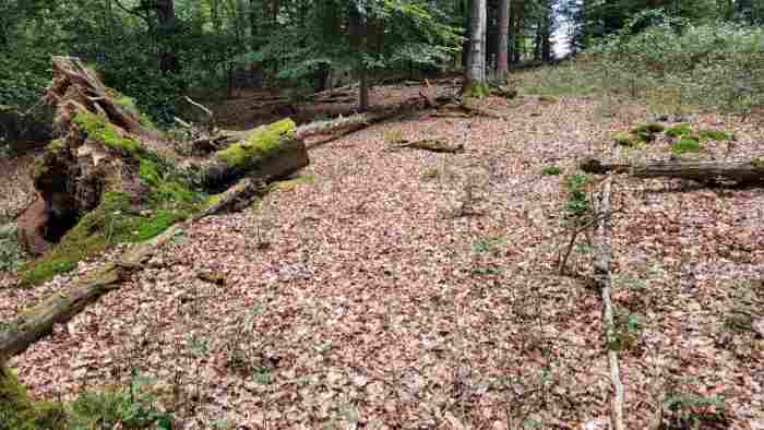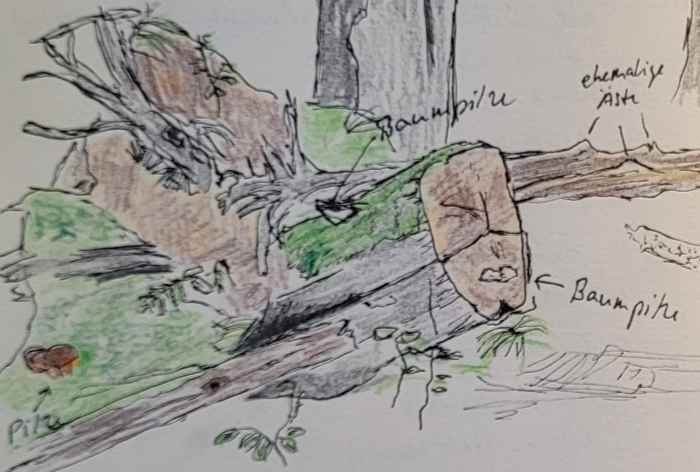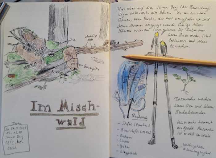 Der Pfad hoch auf den Sünger Berg ist ziemlich zugewachsen. Ich suchte nach einen ruhigen Sitzplatz für eine Zeichnung. Fand ihn auf einer Lichtung zwischen einigen Totholzbäumen.
