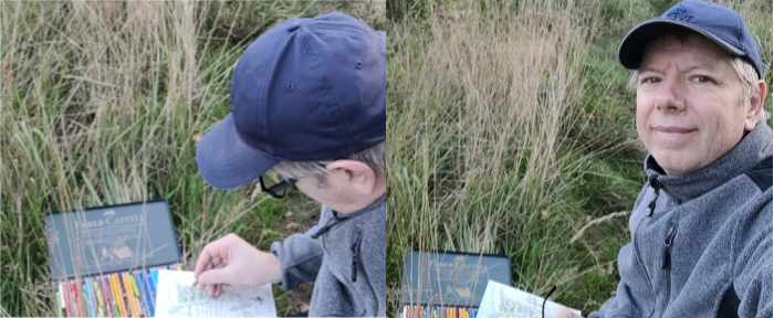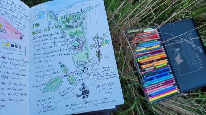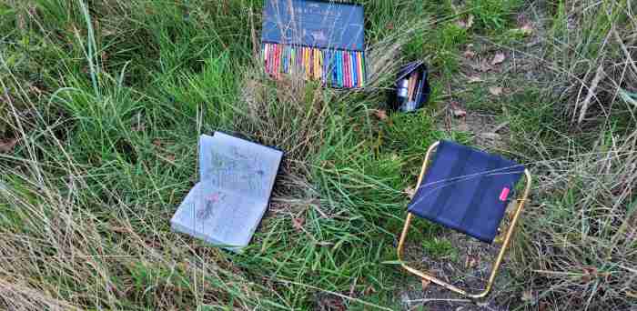 Wieder ging ich durch „die Hütte“ auf den Sünger Berg. Auf halber Höhe packte ich meinen Klappsitz und mein Zeichenzeug aus und zeichnete die Landschaft in Richtung Bonnersüng.