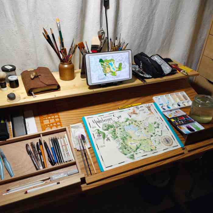 Bei den Farben habe ich mich für hochwertige Aquarellfarben aus Tuben entschieden. Sie sind mit Wasser immer wieder anzulösen, daher gibt es keine Reste, die entsorgt werden müssen. Bei den Pinseln gibt es mittlerweile echt gute Synthetische alternativen zu Echthaarpinseln. Daher verwende ich eher diese. Mir reicht eine kleine Auswahl von vier bis fünf Lieblingspinsel. Beim Papier teste ich mich leider noch immer, auf der Suche nach einer guten Preis-Leistung, durch verschiedene Hersteller und Qualitäten.
