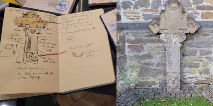Ich setzte mich auf meinen Dreibeinhocker und zeichnete das Gedenkkreuz des Rembert Dietherich von Cloeth. Seine Geschichte kannte ich noch. Er war 1695 an der Schätzmühle im Sülztal von seinem Pferd gefallen und gestorden. Das an dieser Stelle aufgestellte Kreuz wurde 1920 dann an der Kirche befestigt. Der Text dazu steht auf dem Kreuz, ist aber doch recht schwer zu entziffern.
