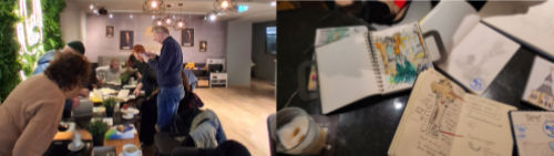 Wir skizzierten rund 40 Minuten und gingen in „Schneiders Café“ (Ecke Kirchplatz/Dr.-Meinerzhagen-Straße), wo wir noch schnell Tische reserviert hatten. Langsam war es am Rücken doch etwas kalt geworden, so dass die Wärme im Café gut tat. Wenig später saßen wir schon mit Getränke an den Tischen und bestaunten unsere Skizzen.