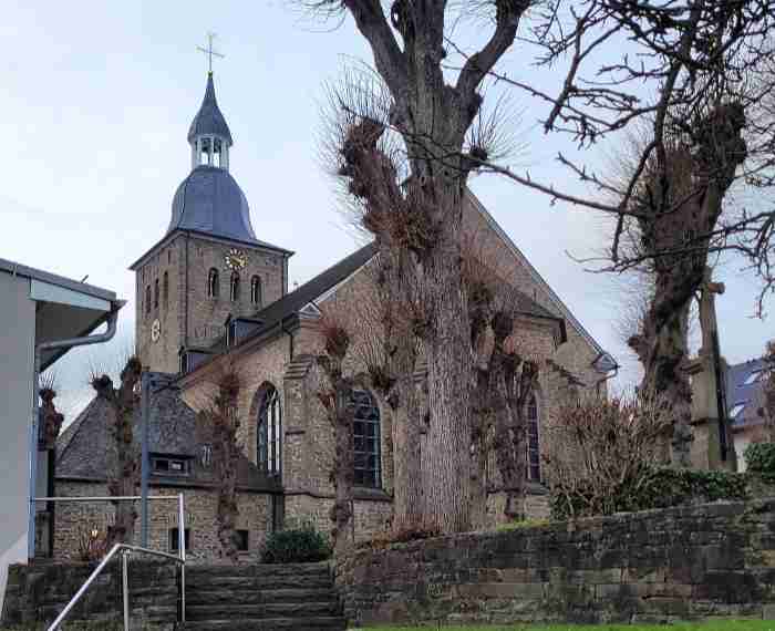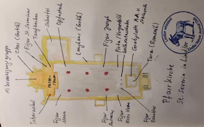 Lindlar skizziert: Kirche St. Severin. Treffpunkt: Arche Noah-Stein am Chor der Kirche, schräggegenüber des Eingangs der Pfarrbücherei (Severinus Haus), Hauptstraße 3.