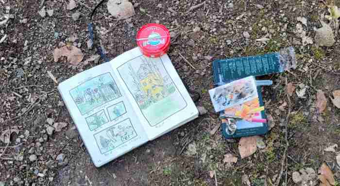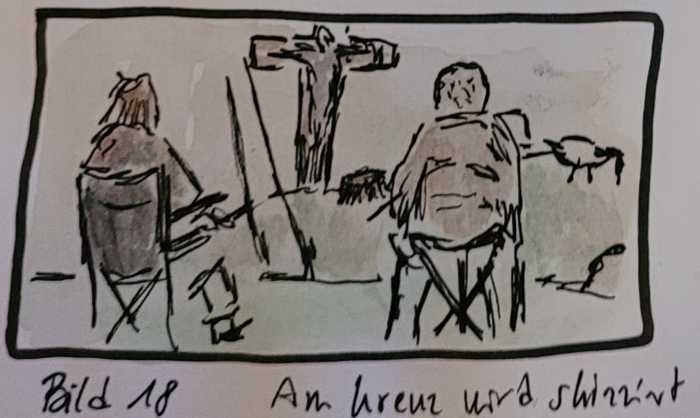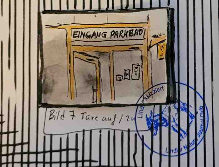 Treffpunkt war der Eingang des Parkbads …… nachdem alle ihre Namensschilder hatten, gingen wir vorbei an Parkplatz und Freizeitpark hinüber zum Schlosspark …… von Klappstühlen und Dreibeinhockern sowie von Bänken aus skizzierten wir nun die Umgebung des Schlossweihers …hier mit Kunstwerk „Es ist vollbracht“ der Künstlerin Yrsa von Leistner …… nicht für jede Perspektive gab es einen Sitzplatz …Mein Klappsitz/Rucksack mit Skizzenjournal und Malzeug.Mein Skizzenjournal, Pulmoll: -Malkasten-Eigenbau, Wassertankpinsel, Fabel-Castell: -Buntstifte und wasserfeste -Pitt Artist Pens.
