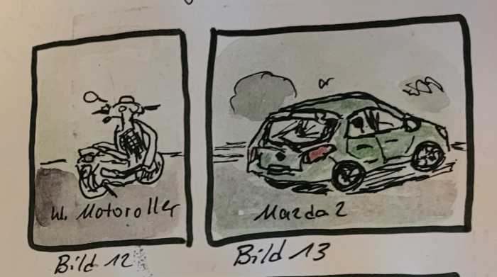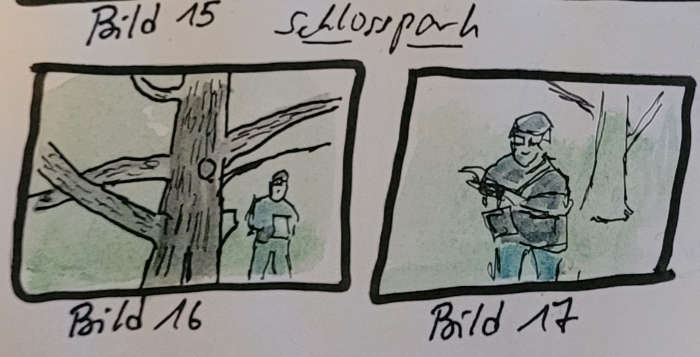 Ich versuchte mich an mehreren kleinen Skizzen, deren Rahmen ich schon vorher in meinen Skizzenjournal gezeichnet hatte (Panel Sketching). So konnte ich eine kleine Geschichte erzählen.