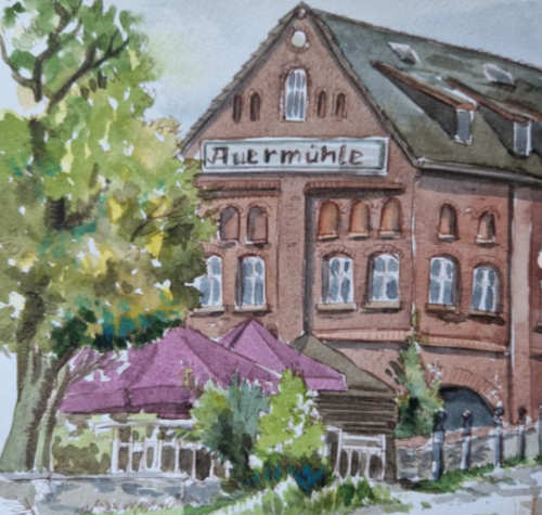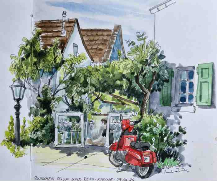 In Hilden wurden im Rahmen der Sommerakademie Urban-Sketching-Kurse angeboten. So kam ich erstmals mit dieser Art des Zeichnens in Berührung. Mich hat sofort begeistert, wie unkompliziert und spontan man mit wenig Material kreativ sein kann. Das war genau das, was ich für mich gesucht habe.