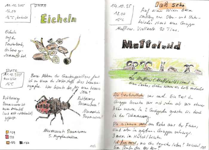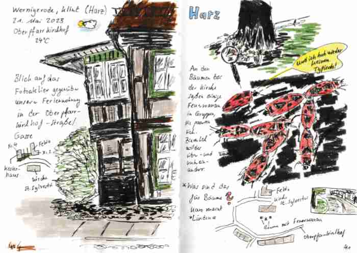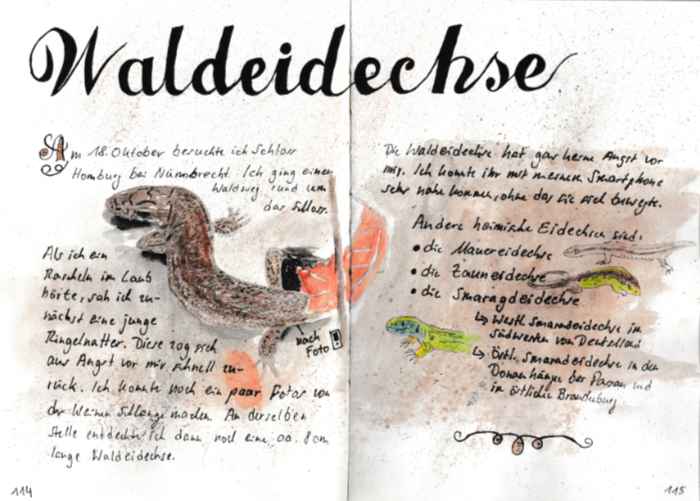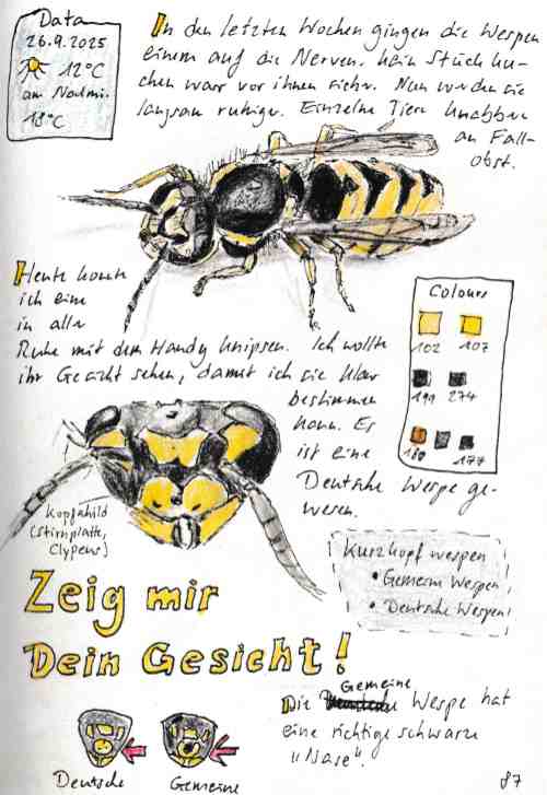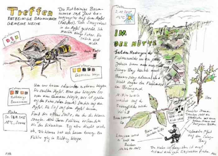 In diesem Skizzenbuch machte ich reines Nature Journaling. Oftmals sind die Skizzen nur zuhause nach meinen eigenen Fotos entstanden. Die Diskussion, ob vor Ort oder nach Fotos, wird zwar im Nature Journaling geführt, aber stets wird wohlwollend mit, mach es so wie du willst zügig beendet. Gerade bei Tieren, insbesondere bei Insekten, ist es schwer Details vor Ort zu beobachten und zu skizzieren.