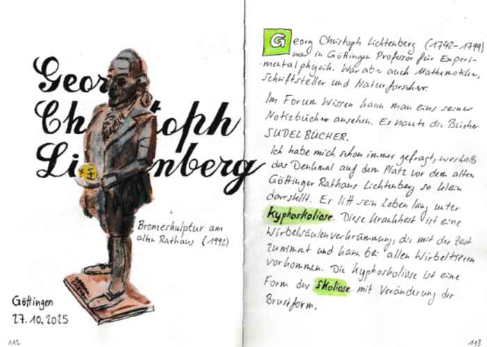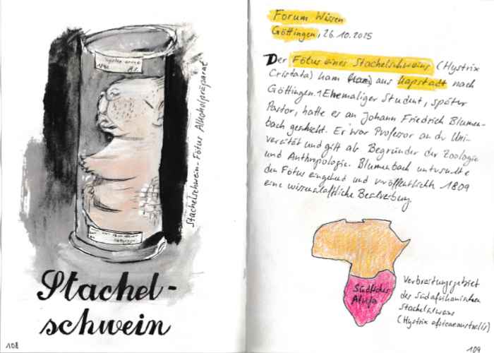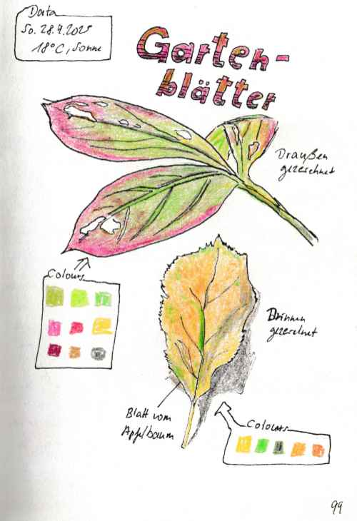 Das „Hahnemühle Sketch Book“ hat 124 Seiten im A5-Format. Auf den meisten Seiten habe ich nur mit Buntstiften gezeichnet. Ganz wenige haben auch Gouachefarbe und etwas Wasser abbekommen.