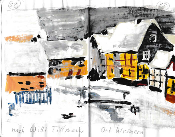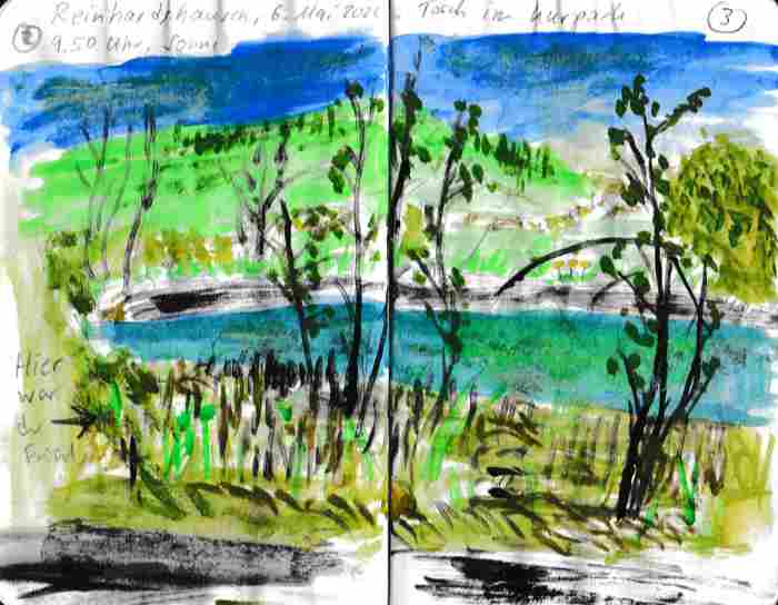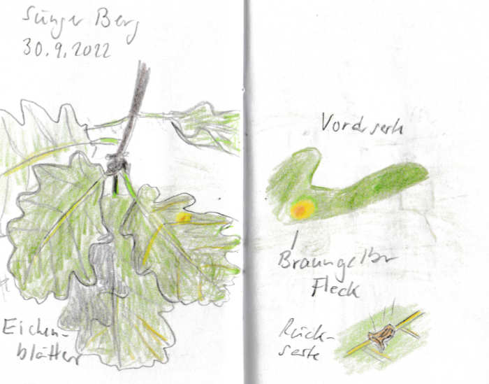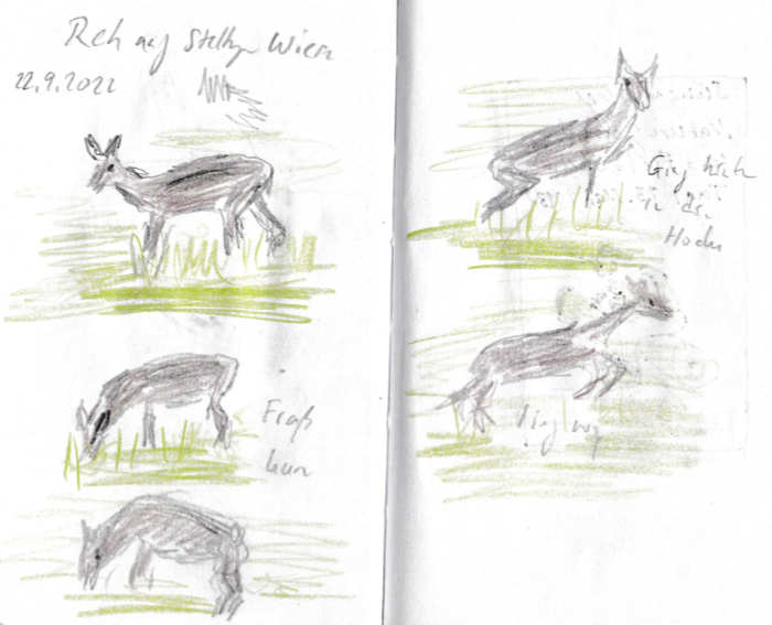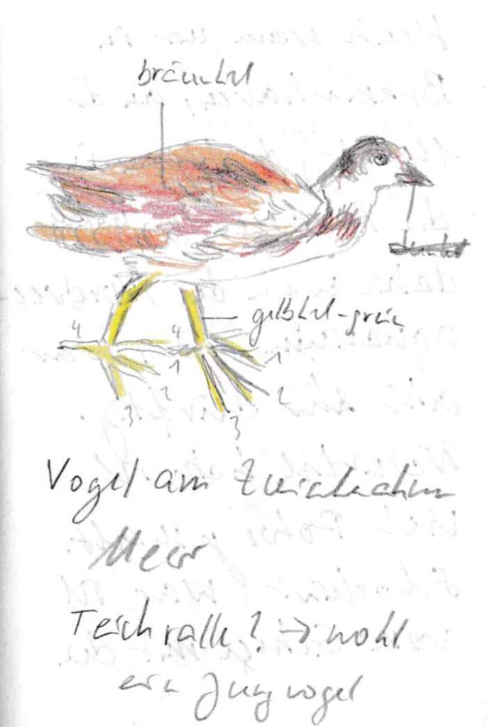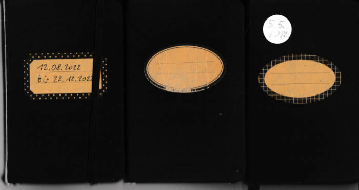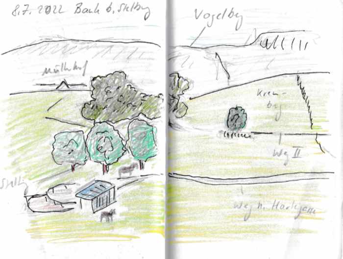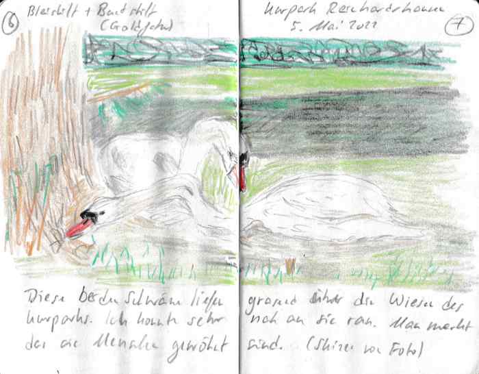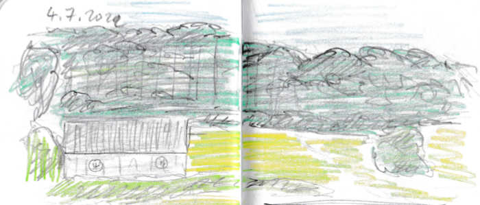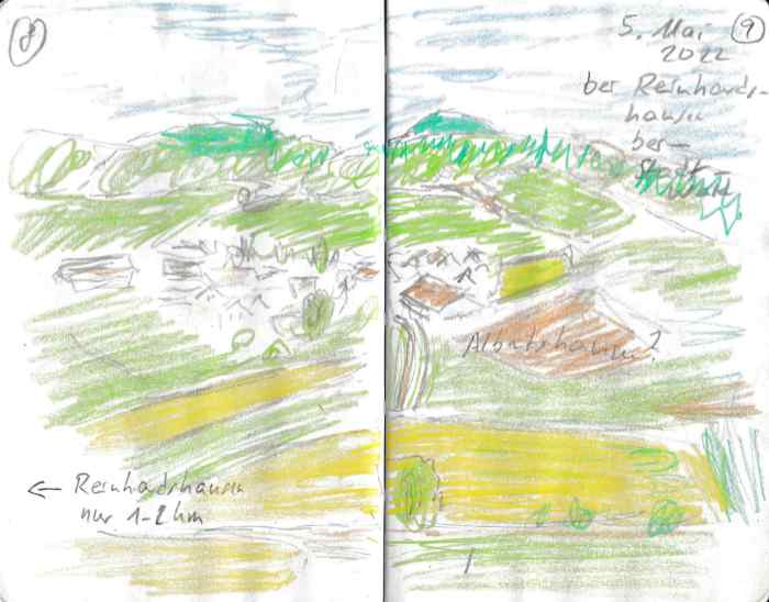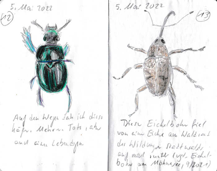Diese kleinen 9×14 cm Notizbücher passen in jede Hosentasche. 2022 und 2023 habe ich davon drei Stück vollgekritzelt. Oft habe ich unterwegs vor Ort kleine Skizzen gemacht, aber auch noch Fotos (Vögel, Insekten) skizziert.